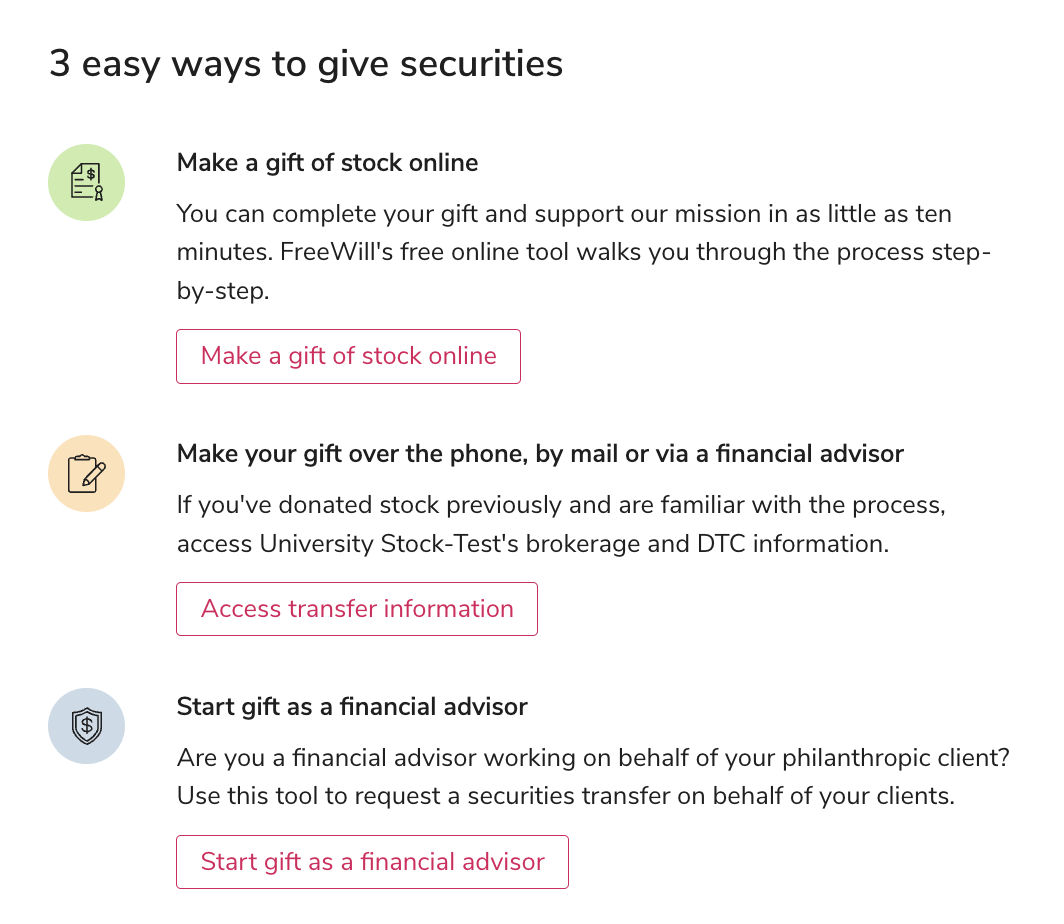 With recent updates to the Stock Tool landing page, supporters gifting stocks and securities can more easily find their preferred method of gifting. When supporters click “Donate stock today”, they will see three options for giving and receive clear instructions for their chosen path.